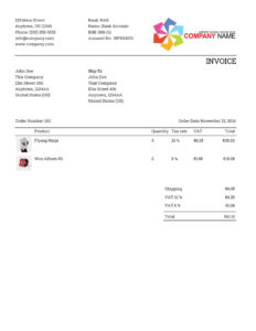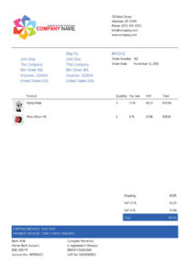 Like the Modern template, this template includes additional columns: 2 extra columns in the header that can be used to display company & bank information. By default, all prices are excluding vat, and the percentage of vat is displayed for each product. Different tax classes are split out in the totals. This template aims to be as complete as possible in displaying prices and taxes to meet more strict tax regulations.